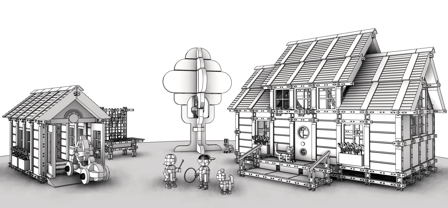Pour des structures fonctionnelles à l'échelle réelle, KOMBINO évolue avec son extension AMIKO, adaptée aux projets extérieurs et aux constructions robustes.